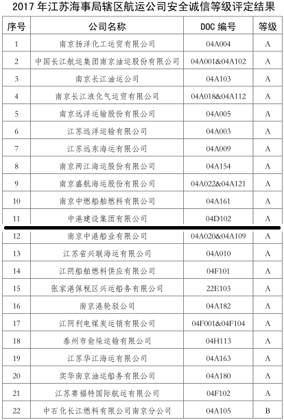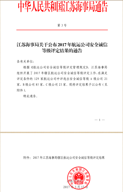 中港建設(shè)集團(tuán)榮獲“江蘇海事局安全誠(chéng)信等級(jí)A級(jí)公司” 榮譽(yù)稱號(hào)