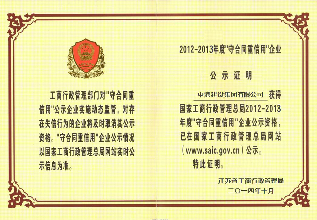 中港建設集團上榜國家工商總局2012~2013年度“守合同重信用”企業(yè)名單。據(jù)悉,國家工商總局向社會公示企業(yè)共計5035家,其中2012~2013年度首次公示的“守合同重信用”企業(yè)1850家,已在2010~2011年度公示、申請繼續(xù)公示的“守合同重信用”企業(yè)3185家。